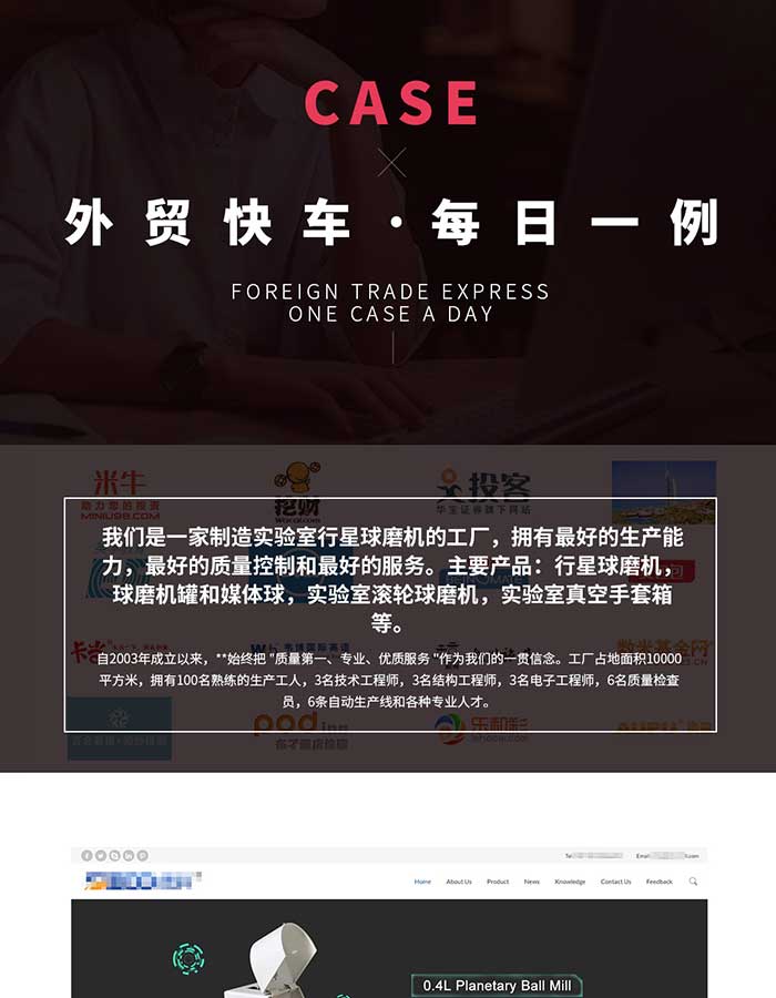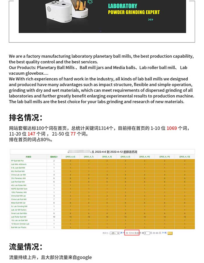 客戶公司成立于2003年,是一家專業(yè)制造實(shí)驗(yàn)室行星球磨機(jī)、球磨機(jī)罐和媒體球等產(chǎn)品的工廠,工廠占地面積達(dá)一萬平方米,有各種的專業(yè)人生才,能保證好的生產(chǎn)能力,同時(shí)也能把控質(zhì)量以及服務(wù)。自客戶與我們合作獨(dú)立站 外貿(mào)SEO 以來,總統(tǒng)計(jì)關(guān)鍵詞1314個(gè),目前排在谷歌瀏覽器首頁1-10位的詞有1069個(gè),排在首頁的詞占了80%,遠(yuǎn)超合作套餐達(dá)標(biāo)100個(gè)詞在首頁這項(xiàng)條件。通過 外貿(mào)SEO ,網(wǎng)站訪問流量在持續(xù)上升,在過年放假期間詢盤也是接連不停的收到。幫助更多的客戶開拓和搶占海外市場(chǎng),獲取更多流量訂單,是我們一直的初心和目標(biāo)!