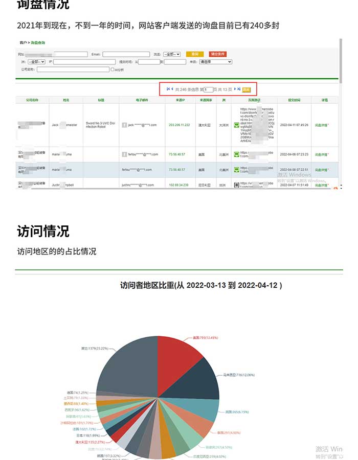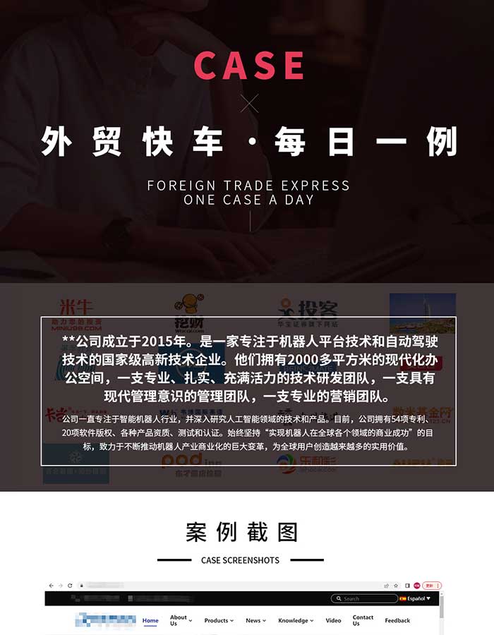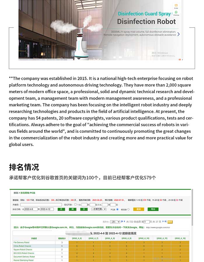 時(shí)代科技不斷發(fā)展,我們國(guó)家也涌現(xiàn)了大批的高新技術(shù)企業(yè),今天要提到的客戶就是一家專注于機(jī)器人平臺(tái)技術(shù)和自動(dòng)駕駛技術(shù)的國(guó)家級(jí)高新技術(shù)企業(yè)。客戶公司成立于2015年,發(fā)展規(guī)模越來越大,擁有2000多平的現(xiàn)代化辦公空間,有專業(yè)的技術(shù)研發(fā)團(tuán)隊(duì),管理團(tuán)隊(duì)以及營(yíng)銷團(tuán)隊(duì)。為實(shí)現(xiàn)機(jī)器人在全球各個(gè)領(lǐng)域的商業(yè)成功,客戶21年與我們合作獨(dú)立站 谷歌推廣 ,合作承諾幫客戶優(yōu)化到谷歌首頁的關(guān)鍵詞為100個(gè),目前已經(jīng)幫客戶優(yōu)化579個(gè)。網(wǎng)站日均流量在174左右,總流量達(dá)33036。從2021年到現(xiàn)在,不到一年時(shí)間,不計(jì)算其他聊天工具,網(wǎng)站客戶端發(fā)送的詢盤已有240多封。
