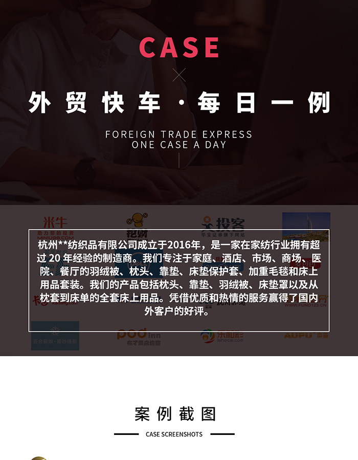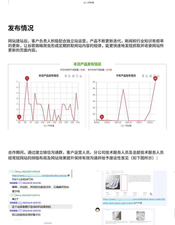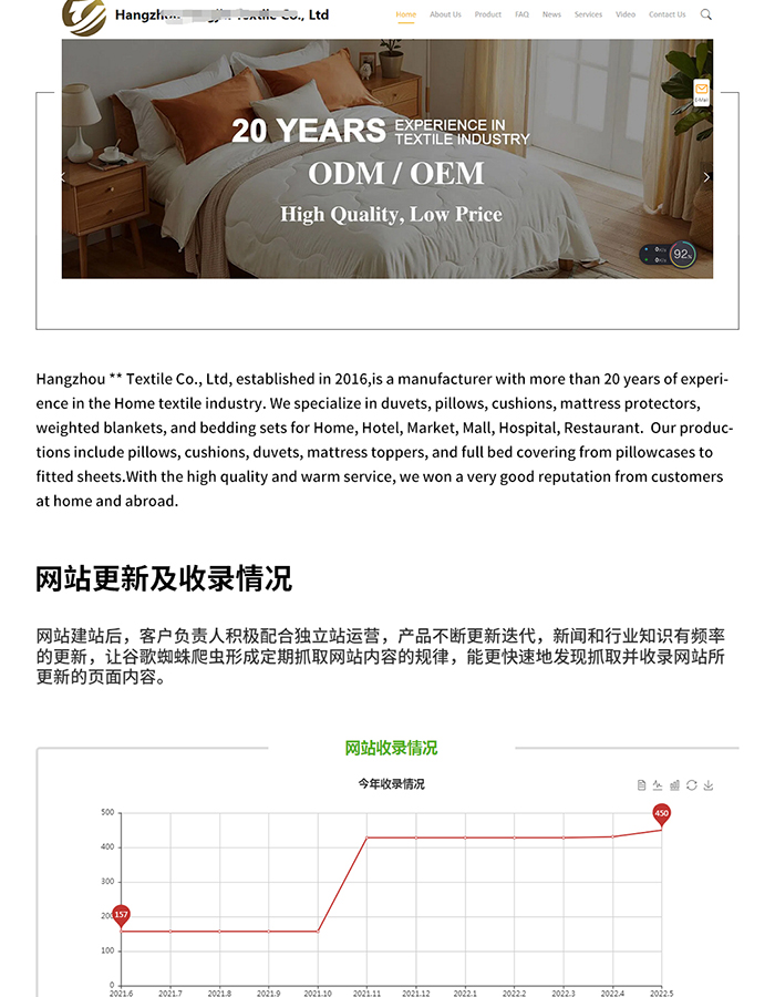 該紡織行業(yè)客戶公司成立于2016年,主營(yíng)產(chǎn)品包括羽絨被、枕頭、靠墊、及從枕套到床單的全套床上用品,在紡織行業(yè)有超過20年的制造經(jīng)驗(yàn)。疫情原因,客戶也越來越注重線上推廣,從而與思億歐結(jié)緣,合作獨(dú)立站進(jìn)行外貿(mào)SEO。建站前期, 我們會(huì)有專人對(duì)接客戶,詳細(xì)講解外貿(mào)SEO 中的引擎收錄原理;外貿(mào)SEO 合作期間,分部及總部的技術(shù)服務(wù)人員經(jīng)常都會(huì)就提升網(wǎng)站效果給予建設(shè)性意見,客戶負(fù)責(zé)人也非常積極的配合獨(dú)立站運(yùn)營(yíng),定頻更新內(nèi)容有助于保持網(wǎng)站活躍度及有利于被收錄。在雙方共同配合之下,客戶接到的首個(gè)訂單就有八萬美金,堅(jiān)信以后的訂單也會(huì)越來越多,金額越來越大。